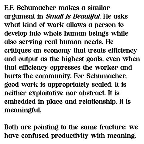E.F. Schumacher makes a similar argument in Small Is Beautiful. He asks what kind of work allows a person to develop into whole human beings while also serving real human needs. He critiques an economy that treats efficiency and output as the highest goals, even when that efficiency oppresses the worker and hurts the community. For Schumacher, good work is appropriately scaled. It is neither exploitative nor abstract. It is embedded in place and relationship. It is meaningful.