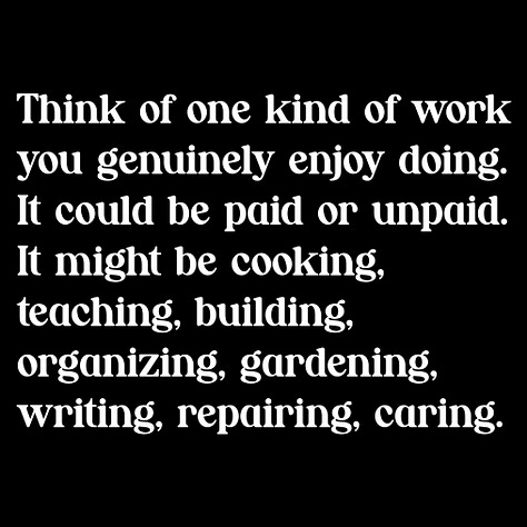 Think of one kind of work you genuinely enjoy doing. It could be paid or unpaid. It might be cooking, teaching, building, organizing, gardening, writing, repairing, caring.