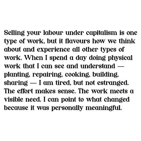 Selling your labour under capitalism is one type of work, but it flavours how we think about and experience all other types of work. When I spend a day doing physical work that I can see and understand — planting, repairing, cooking, building, sharing — I am tired, but not estranged. The effort makes sense. The work meets a visible need. I can point to what changed because it was personally meaningful.