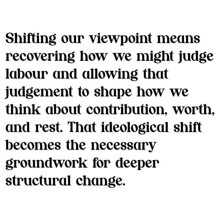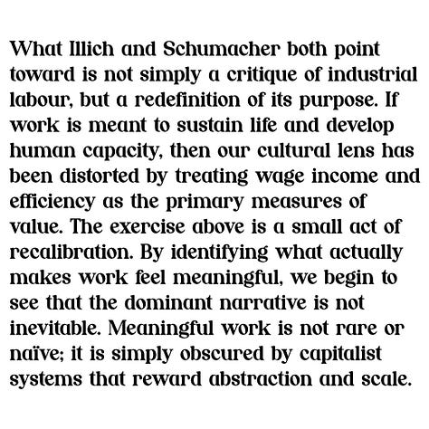 What Illich and Schumacher both point toward is not simply a critique of industrial labour, but a redefinition of its purpose. If work is meant to sustain life and develop human capacity, then our cultural lens has been distorted by treating wage income and efficiency as the primary measures of value. The exercise above is a small act of recalibration. By identifying what actually makes work feel meaningful, we begin to see that the dominant narrative is not inevitable. Meaningful work is not rare or naïve; it is simply obscured by capitalist systems that reward abstraction and scale. Shifting our viewpoint means recovering how we might judge labour and allowing that judgement to shape how we think about contribution, worth, and rest. That ideological shift becomes the necessary groundwork for deeper structural change.