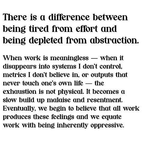 When work is meaningless — when it disappears into systems I don’t control, metrics I don’t believe in, or outputs that never touch one’s own life — the exhaustion is not physical. It becomes a slow build up malaise and resentment. Eventually, we begin to believe that all work produces these feelings and we equate work with being inherently oppressive.