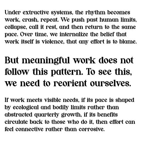 Under extractive systems, the rhythm becomes work, crash, repeat. We push past human limits, collapse, call it rest, and then return to the same pace. Over time, we internalize the belief that work itself is violence, that any effort is to blame.