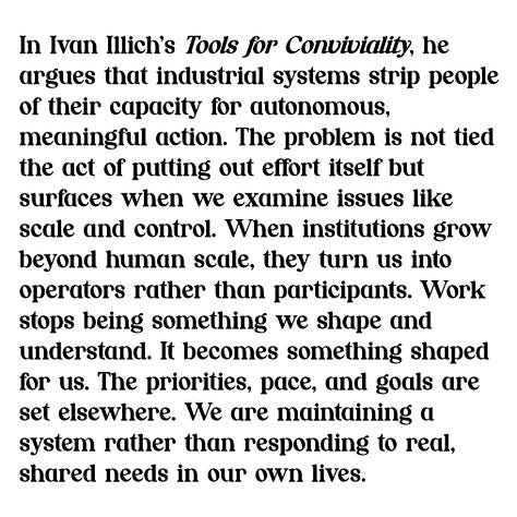 In Ivan Illich’s Tools for Conviviality, he argues that industrial systems strip people of their capacity for autonomous, meaningful action. The problem is not tied the act of putting out effort itself but surfaces when we examine issues like scale and control. When institutions grow beyond human scale, they turn us into operators rather than participants. Work stops being something we shape and understand. It becomes something shaped for us. The priorities, pace, and goals are set elsewhere. We are maintaining a system rather than responding to real, shared needs in our own lives.