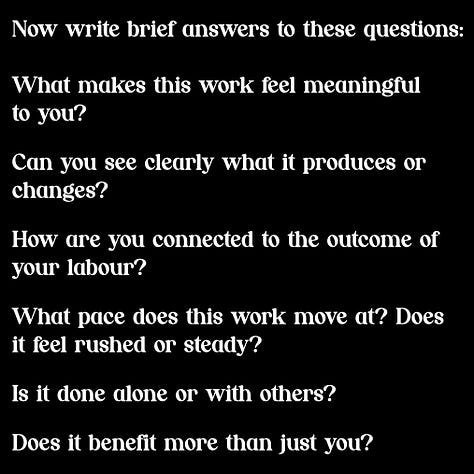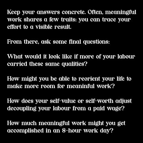 What would it look like if more of your labour carried these same qualities? How might you be able to reorient your life to make more room for meaningful work? How does your self-value or self-worth adjust decoupling your labour from a paid wage? How much meaningful work might you get accomplished in an 8-hour work day?