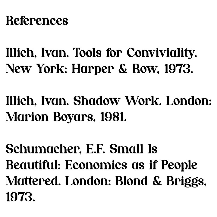 Illich, Ivan. Tools for Conviviality. New York: Harper & Row, 1973.