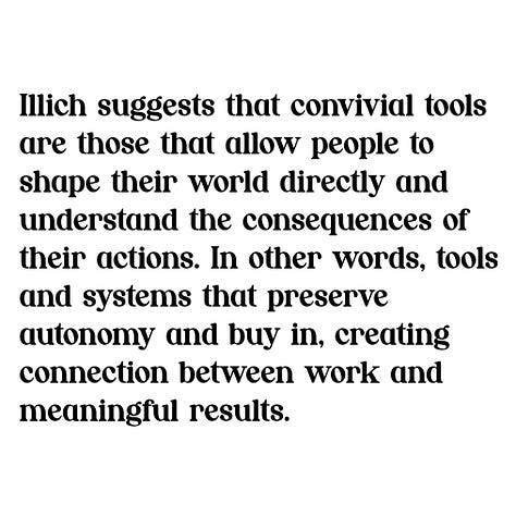 Illich suggests that convivial tools are those that allow people to shape their world directly and understand the consequences of their actions. In other words, tools and systems that preserve autonomy and buy in, creating connection between work and meaningful results.